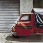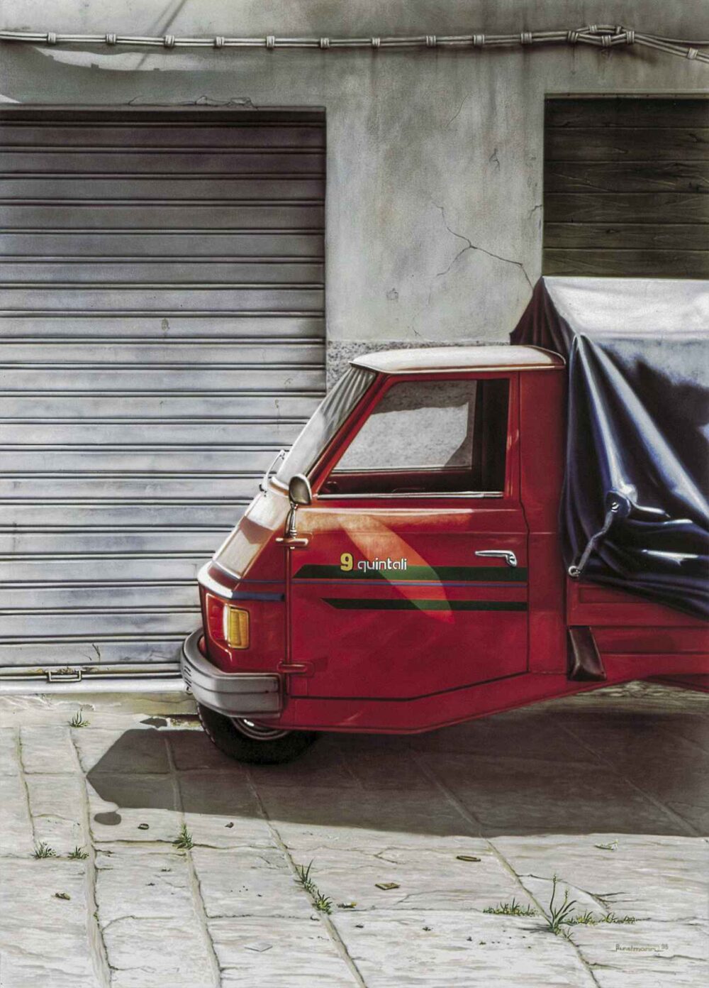 Das Gemälde "Ape" aus dem Jahr 1998 zeigt ein ikonisches "Ape" in der Farbe Rot, das vor einer verwitterten, mediterranen Hauswand parkt. Die Hauswand, mit den klassischen Rolltoren und der verblassten und rissigen Oberfläche, verleiht dem Bild eine morbide und nostalgische Atmosphäre. Der Kontrast zwischen dem leuchtenden Rot des Ape und der blassen, abgenutzten Fassade des Hauses zieht den Betrachter in seinen Bann. Die Details des Fahrzeugs, mit dem Lichtreflex des Außenspiegels, sind in einem hyperrealistischen Stil dargestellt, der die Texturen und Materialien fast greifbar erscheinen lässt. Diese Komposition vermittelt ein Gefühl von Verlassenheit und Ruhe, während sie gleichzeitig die zeitlose Schönheit des Alltagslebens in einer mediterranen Umgebung einfängt.